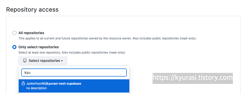 Only select repositories 를 선택하고, Select repositories 에서 방금 생성했던 저장소를 선택해 설치해줍니다