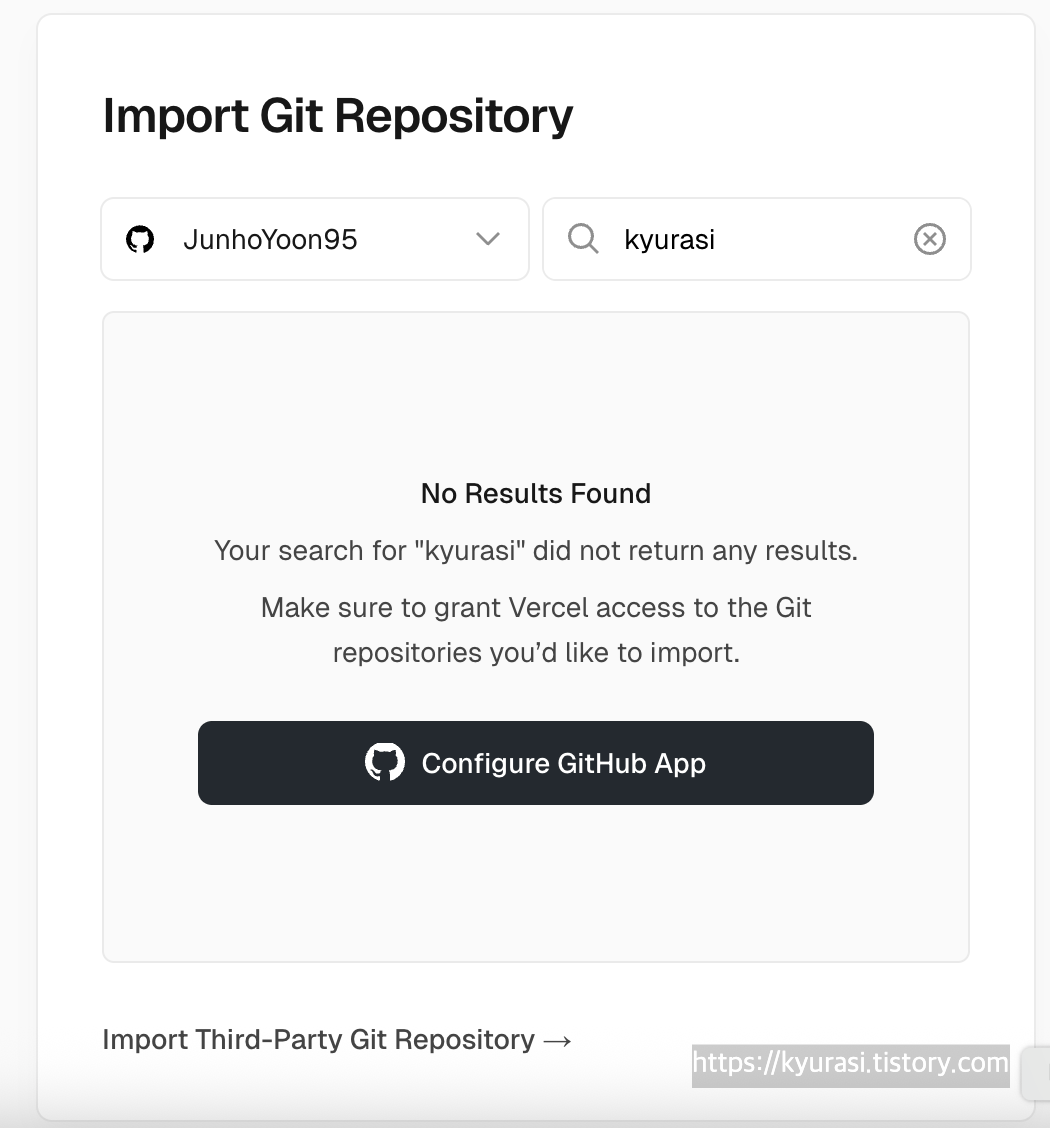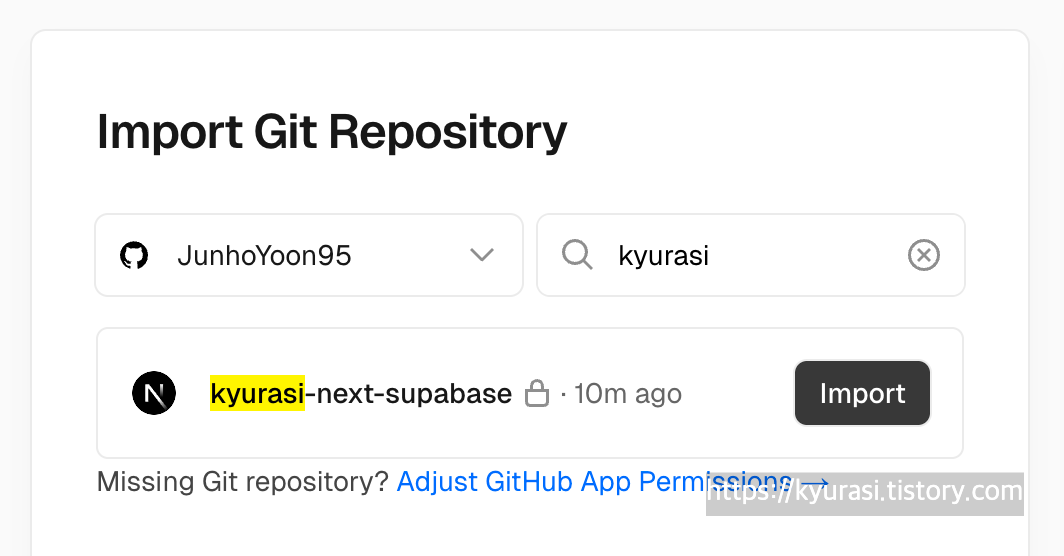 이제 깃헙에서 Vercel 확장을 설치했으니, Vercel 로 돌아가면 이 저장소가 보이게 될 것입니다